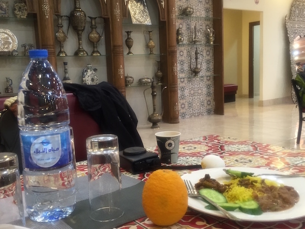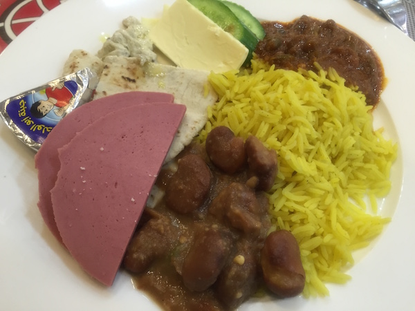 Di satu bahagian ada roti Arab, kepingan sosej, keju, butter, dan beberapa pilihan jordanian dressing. Di satu bahagian lagi ada nasi berwarna kuning, timun jepun, telur rebus dengan 2 jenis lauk.